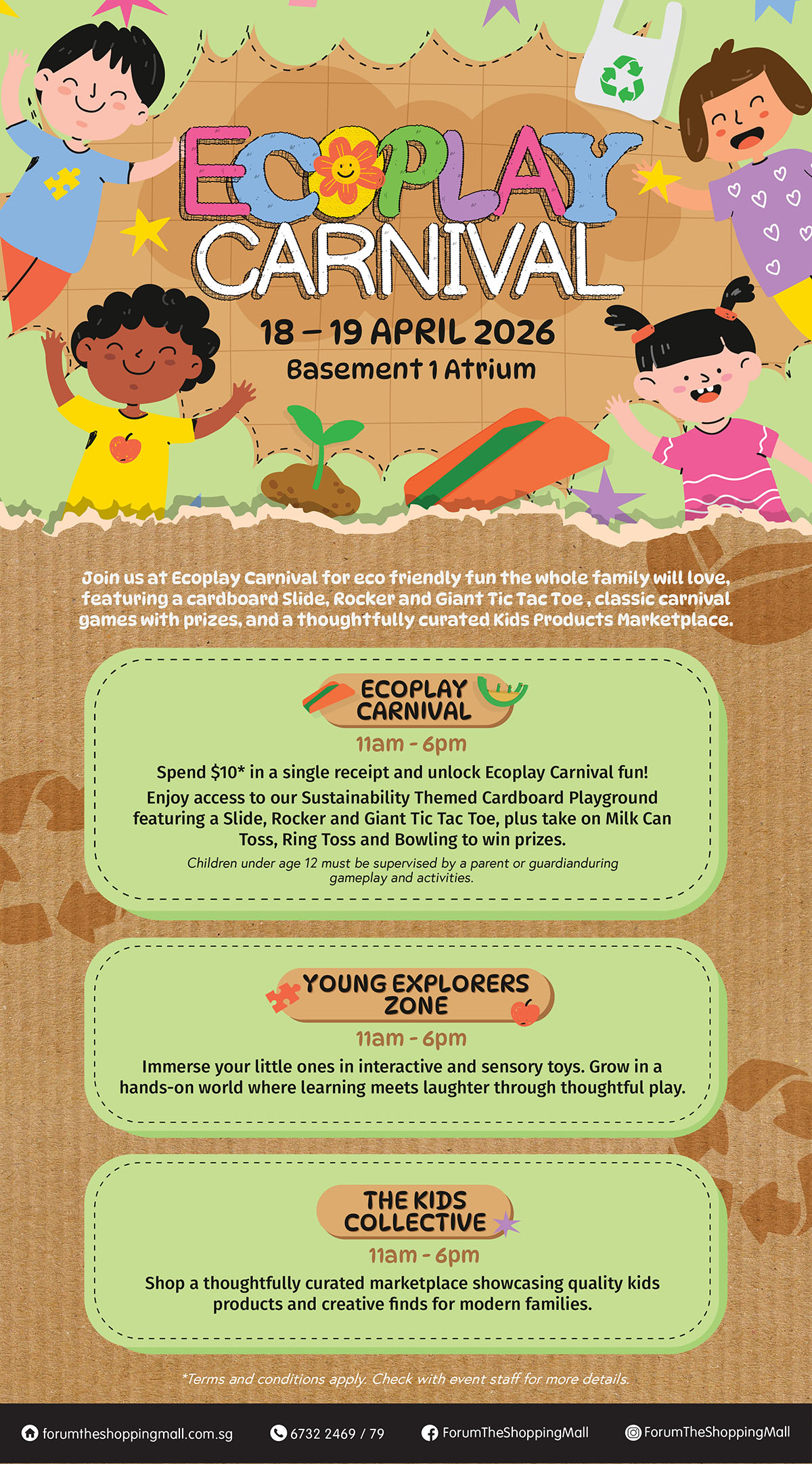 Join us at Ecoplay Carnival for a eco friendly fun the whole family will love, featuring a cardboard Slide, Rocker, and Giant Tic Tac Toe, classical carnival games with prizes, and a thoughtfully curated Kids Products Marketplace.